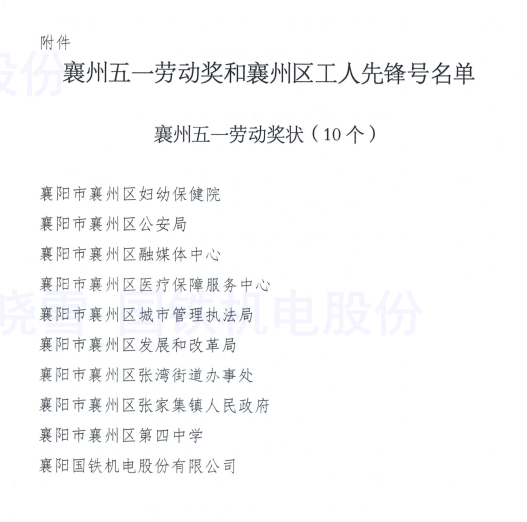 熱烈祝賀:襄陽國鐵機電股份有限公司被襄州區(qū)總工會授予五一勞動獎狀、襄陽國鐵機電股份有限公司曾建勇勞模創(chuàng)新工作室被襄陽市總工會和襄州區(qū)總工會授予職工(勞模、工匠)創(chuàng)新工作室!